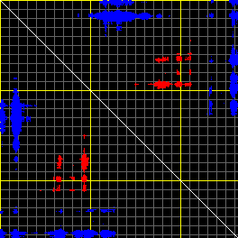 This matrix displays the maximum distance fluctuations between all pairs of CA atoms and between the two extreme conformations that were computed for this mode (DQMIN/DQMAX). Distance increases are plotted in blue and decreases in red for the strongest 10% of the residue pair distance changes. Every pixel corresponds to a single residue. Grey lines are drawn every 10 residues, yellow lines every 100 residues (counting from the upper left corner).