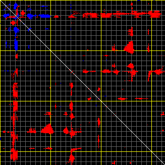 This matrix displays the maximum distance fluctuations between all pairs of CA atoms and between the two extreme conformations that were computed for this mode (DQMIN/DQMAX). Distance increases are plotted in blue and decreases in red for the strongest 10% of the residue pair distance changes. Every pixel corresponds to a single residue. Grey lines are drawn every 10 residues, yellow lines every 100 residues (counting from the upper left corner).