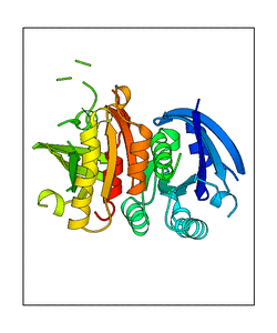 These views are prepared from three orthologuous viewpoints with MolScript. Secondary structures are determined from the C-alpha atom positions of your protein (N-terminal blue, C-terminal red).