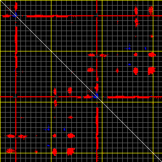 This matrix displays the maximum distance fluctuations between all pairs of CA atoms and between the two extreme conformations that were computed for this mode (DQMIN/DQMAX). Distance increases are plotted in blue and decreases in red for the strongest 10% of the residue pair distance changes. Every pixel corresponds to a single residue. Grey lines are drawn every 10 residues, yellow lines every 100 residues (counting from the upper left corner).