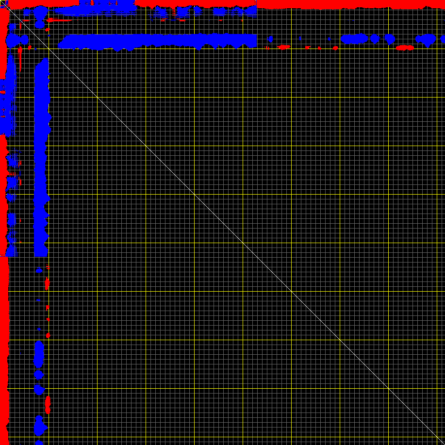 This matrix displays the maximum distance fluctuations between all pairs of CA atoms and between the two extreme conformations that were computed for this mode (DQMIN/DQMAX). Distance increases are plotted in blue and decreases in red for the strongest 10% of the residue pair distance changes. Every pixel corresponds to a single residue. Grey lines are drawn every 10 residues, yellow lines every 100 residues (counting from the upper left corner).