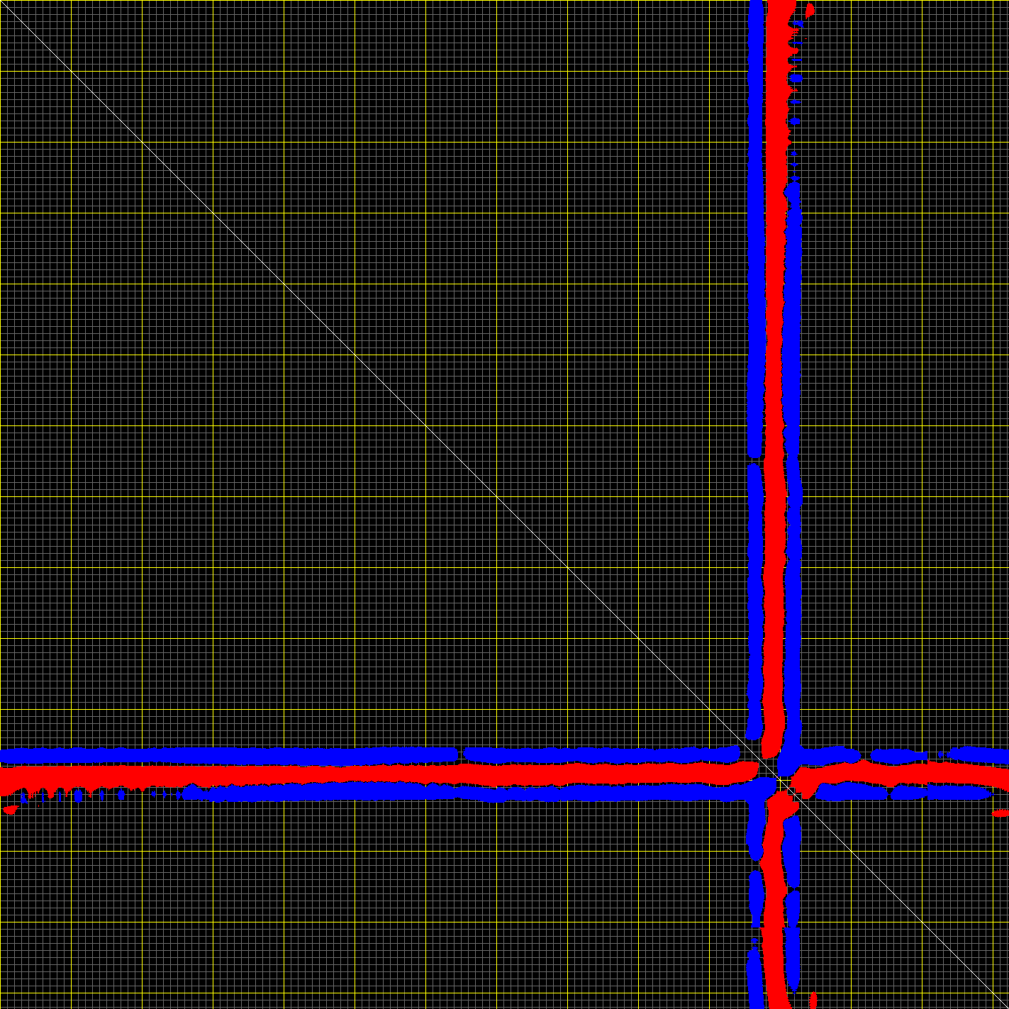 This matrix displays the maximum distance fluctuations between all pairs of CA atoms and between the two extreme conformations that were computed for this mode (DQMIN/DQMAX). Distance increases are plotted in blue and decreases in red for the strongest 10% of the residue pair distance changes. Every pixel corresponds to a single residue. Grey lines are drawn every 10 residues, yellow lines every 100 residues (counting from the upper left corner).