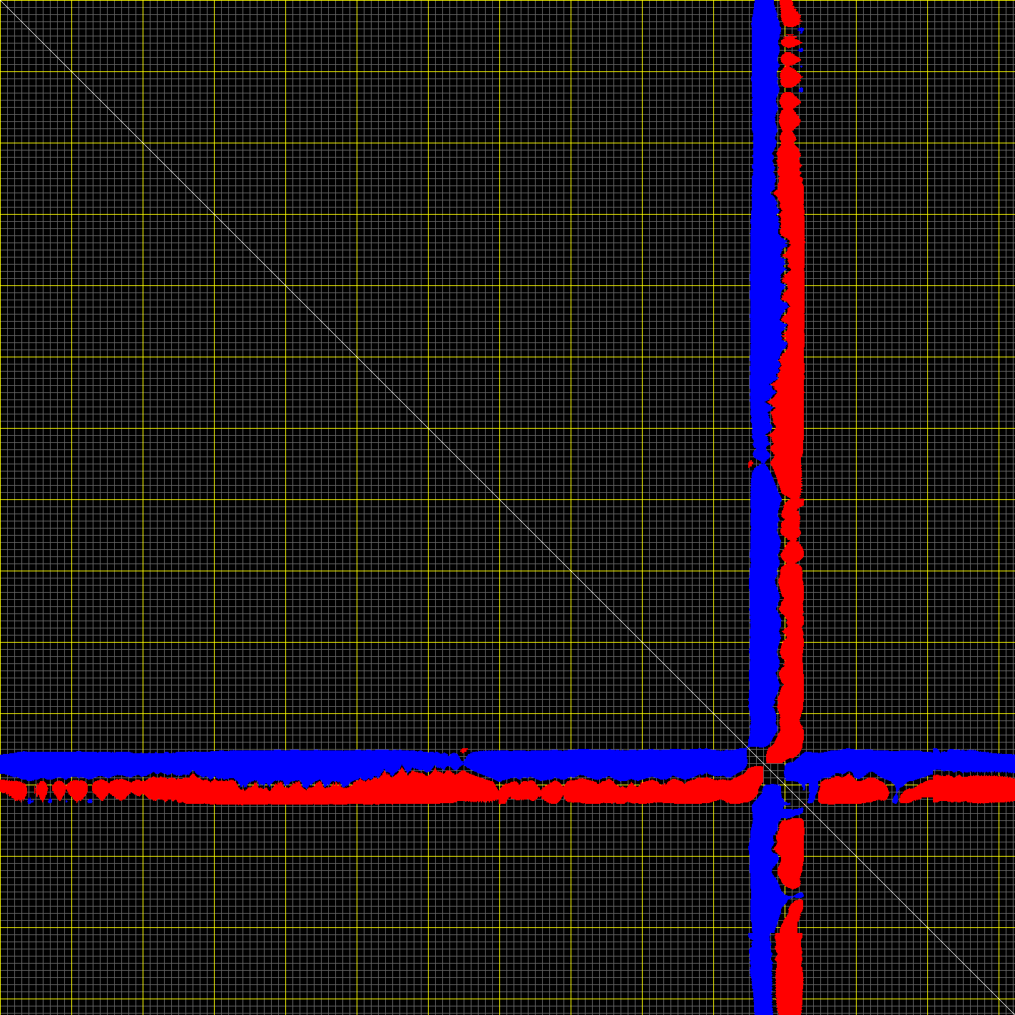 This matrix displays the maximum distance fluctuations between all pairs of CA atoms and between the two extreme conformations that were computed for this mode (DQMIN/DQMAX). Distance increases are plotted in blue and decreases in red for the strongest 10% of the residue pair distance changes. Every pixel corresponds to a single residue. Grey lines are drawn every 10 residues, yellow lines every 100 residues (counting from the upper left corner).