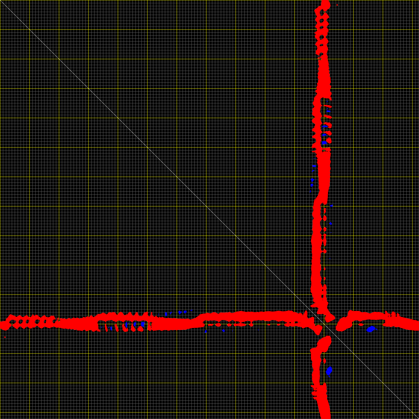This matrix displays the maximum distance fluctuations between all pairs of CA atoms and between the two extreme conformations that were computed for this mode (DQMIN/DQMAX). Distance increases are plotted in blue and decreases in red for the strongest 10% of the residue pair distance changes. Every pixel corresponds to a single residue. Grey lines are drawn every 10 residues, yellow lines every 100 residues (counting from the upper left corner).