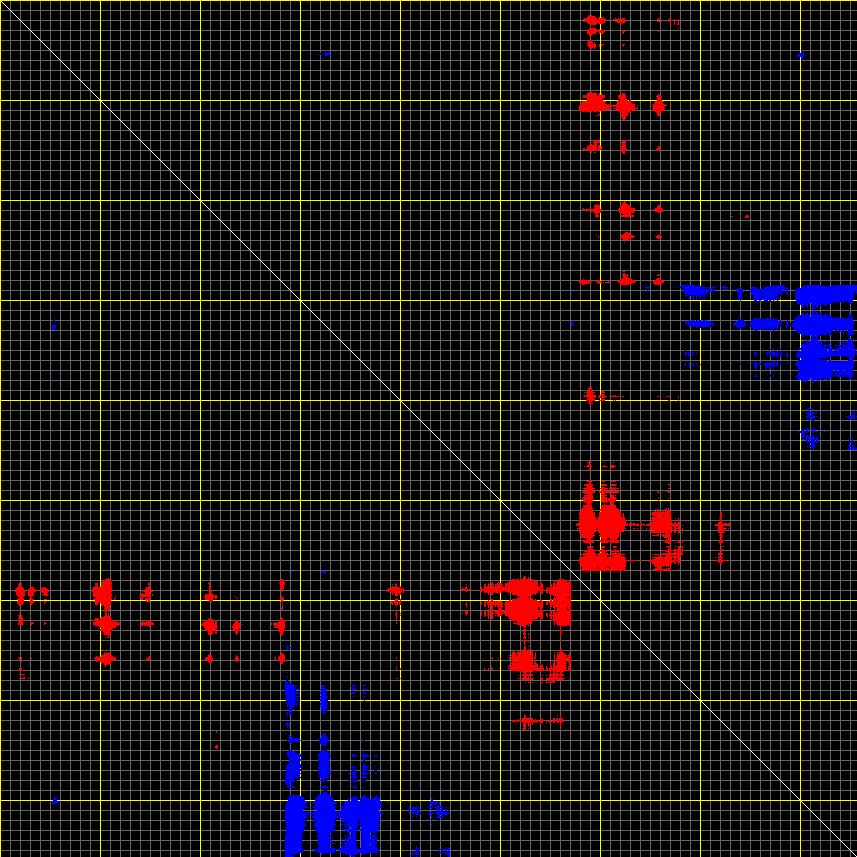 This matrix displays the maximum distance fluctuations between all pairs of CA atoms and between the two extreme conformations that were computed for this mode (DQMIN/DQMAX). Distance increases are plotted in blue and decreases in red for the strongest 10% of the residue pair distance changes. Every pixel corresponds to a single residue. Grey lines are drawn every 10 residues, yellow lines every 100 residues (counting from the upper left corner).