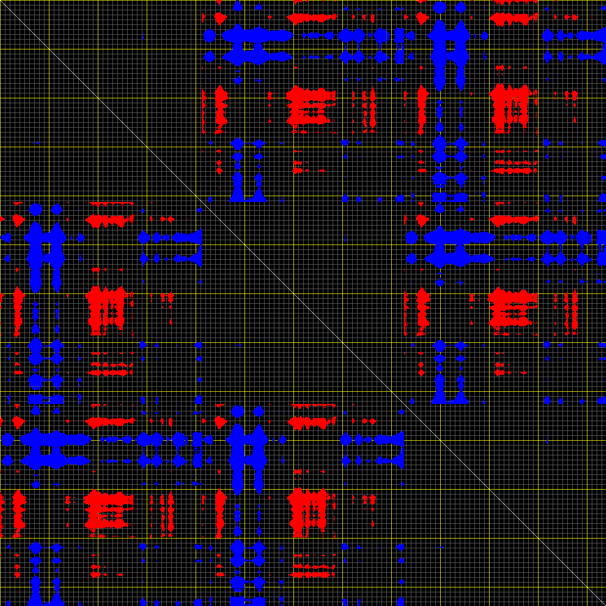 This matrix displays the maximum distance fluctuations between all pairs of CA atoms and between the two extreme conformations that were computed for this mode (DQMIN/DQMAX). Distance increases are plotted in blue and decreases in red for the strongest 10% of the residue pair distance changes. Every pixel corresponds to a single residue. Grey lines are drawn every 10 residues, yellow lines every 100 residues (counting from the upper left corner).
