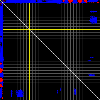This matrix displays the maximum distance fluctuations between all pairs of CA atoms and between the two extreme conformations that were computed for this mode (DQMIN/DQMAX). Distance increases are plotted in blue and decreases in red for the strongest 10% of the residue pair distance changes. Every pixel corresponds to a single residue. Grey lines are drawn every 10 residues, yellow lines every 100 residues (counting from the upper left corner).