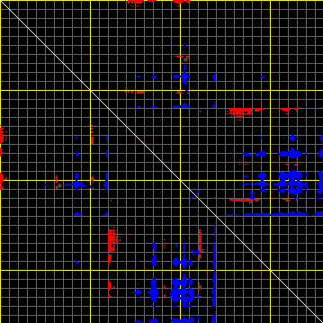 This matrix displays the maximum distance fluctuations between all pairs of CA atoms and between the two extreme conformations that were computed for this mode (DQMIN/DQMAX). Distance increases are plotted in blue and decreases in red for the strongest 10% of the residue pair distance changes. Every pixel corresponds to a single residue. Grey lines are drawn every 10 residues, yellow lines every 100 residues (counting from the upper left corner).