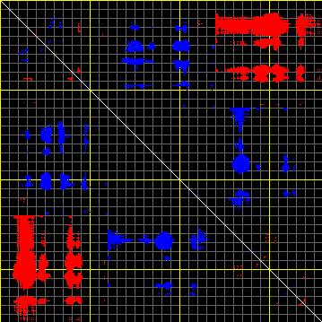 This matrix displays the maximum distance fluctuations between all pairs of CA atoms and between the two extreme conformations that were computed for this mode (DQMIN/DQMAX). Distance increases are plotted in blue and decreases in red for the strongest 10% of the residue pair distance changes. Every pixel corresponds to a single residue. Grey lines are drawn every 10 residues, yellow lines every 100 residues (counting from the upper left corner).