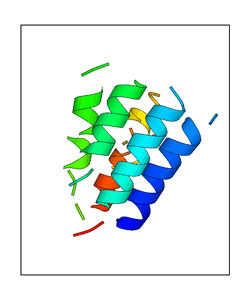 These views are prepared from three orthologuous viewpoints with MolScript. Secondary structures are determined from the C-alpha atom positions of your protein (N-terminal blue, C-terminal red).