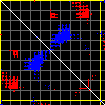 This matrix displays the maximum distance fluctuations between all pairs of CA atoms and between the two extreme conformations that were computed for this mode (DQMIN/DQMAX). Distance increases are plotted in blue and decreases in red for the strongest 10% of the residue pair distance changes. Every pixel corresponds to a single residue. Grey lines are drawn every 10 residues, yellow lines every 100 residues (counting from the upper left corner).
