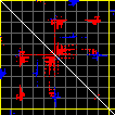 This matrix displays the maximum distance fluctuations between all pairs of CA atoms and between the two extreme conformations that were computed for this mode (DQMIN/DQMAX). Distance increases are plotted in blue and decreases in red for the strongest 10% of the residue pair distance changes. Every pixel corresponds to a single residue. Grey lines are drawn every 10 residues, yellow lines every 100 residues (counting from the upper left corner).