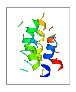 These views are prepared from three orthologuous viewpoints with MolScript. Secondary structures are determined from the C-alpha atom positions of your protein (N-terminal blue, C-terminal red).