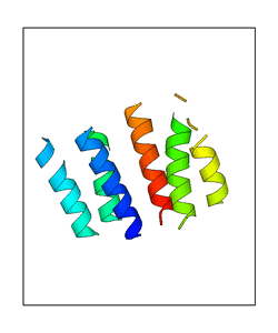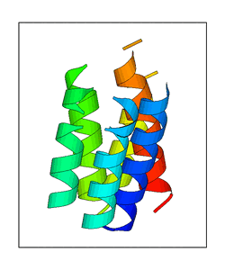 These views are prepared from three orthologuous viewpoints with MolScript. Secondary structures are determined from the C-alpha atom positions of your protein (N-terminal blue, C-terminal red).