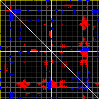 This matrix displays the maximum distance fluctuations between all pairs of CA atoms and between the two extreme conformations that were computed for this mode (DQMIN/DQMAX). Distance increases are plotted in blue and decreases in red for the strongest 10% of the residue pair distance changes. Every pixel corresponds to a single residue. Grey lines are drawn every 10 residues, yellow lines every 100 residues (counting from the upper left corner).