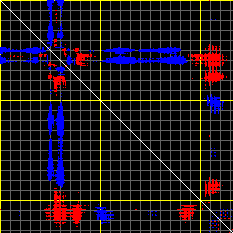 This matrix displays the maximum distance fluctuations between all pairs of CA atoms and between the two extreme conformations that were computed for this mode (DQMIN/DQMAX). Distance increases are plotted in blue and decreases in red for the strongest 10% of the residue pair distance changes. Every pixel corresponds to a single residue. Grey lines are drawn every 10 residues, yellow lines every 100 residues (counting from the upper left corner).