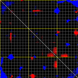 This matrix displays the maximum distance fluctuations between all pairs of CA atoms and between the two extreme conformations that were computed for this mode (DQMIN/DQMAX). Distance increases are plotted in blue and decreases in red for the strongest 10% of the residue pair distance changes. Every pixel corresponds to a single residue. Grey lines are drawn every 10 residues, yellow lines every 100 residues (counting from the upper left corner).