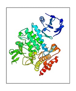 These views are prepared from three orthologuous viewpoints with MolScript. Secondary structures are determined from the C-alpha atom positions of your protein (N-terminal blue, C-terminal red).