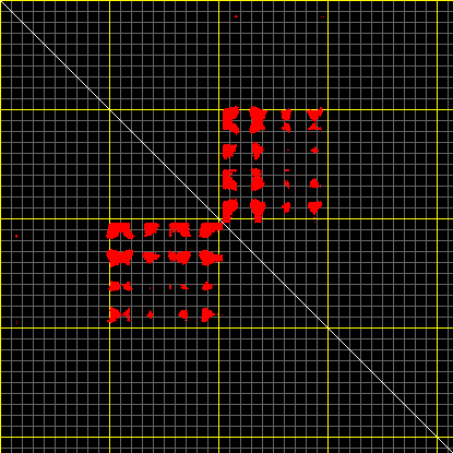 This matrix displays the maximum distance fluctuations between all pairs of CA atoms and between the two extreme conformations that were computed for this mode (DQMIN/DQMAX). Distance increases are plotted in blue and decreases in red for the strongest 10% of the residue pair distance changes. Every pixel corresponds to a single residue. Grey lines are drawn every 10 residues, yellow lines every 100 residues (counting from the upper left corner).
