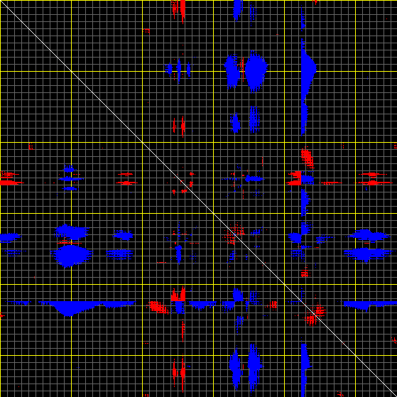 This matrix displays the maximum distance fluctuations between all pairs of CA atoms and between the two extreme conformations that were computed for this mode (DQMIN/DQMAX). Distance increases are plotted in blue and decreases in red for the strongest 10% of the residue pair distance changes. Every pixel corresponds to a single residue. Grey lines are drawn every 10 residues, yellow lines every 100 residues (counting from the upper left corner).