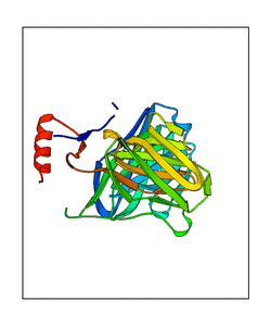 These views are prepared from three orthologuous viewpoints with MolScript. Secondary structures are determined from the C-alpha atom positions of your protein (N-terminal blue, C-terminal red).