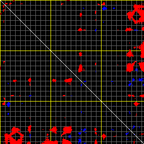This matrix displays the maximum distance fluctuations between all pairs of CA atoms and between the two extreme conformations that were computed for this mode (DQMIN/DQMAX). Distance increases are plotted in blue and decreases in red for the strongest 10% of the residue pair distance changes. Every pixel corresponds to a single residue. Grey lines are drawn every 10 residues, yellow lines every 100 residues (counting from the upper left corner).