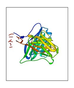 CAUTION: The amplitude range presented in these views corresponds to the highest (DQMAX) and lowest (DQMIN) perturbations chosen for this mode. Secondary structures can break down (and thus disappear from the animation) if the applied amplitudes are too large for Molscript to identify them. The choice of the amplitude is not a NMA result, but has to be done by the user on physical grounds. To change the amplitude range, you can recompute the animation of the desired mode by using the "Compute additional perturbed models with elNémo" section on the results page of your job.