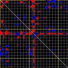 This matrix displays the maximum distance fluctuations between all pairs of CA atoms and between the two extreme conformations that were computed for this mode (DQMIN/DQMAX). Distance increases are plotted in blue and decreases in red for the strongest 10% of the residue pair distance changes. Every pixel corresponds to a single residue. Grey lines are drawn every 10 residues, yellow lines every 100 residues (counting from the upper left corner).