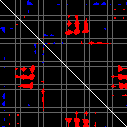 This matrix displays the maximum distance fluctuations between all pairs of CA atoms and between the two extreme conformations that were computed for this mode (DQMIN/DQMAX). Distance increases are plotted in blue and decreases in red for the strongest 10% of the residue pair distance changes. Every pixel corresponds to a single residue. Grey lines are drawn every 10 residues, yellow lines every 100 residues (counting from the upper left corner).