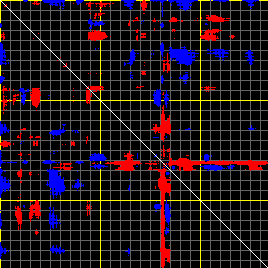 This matrix displays the maximum distance fluctuations between all pairs of CA atoms and between the two extreme conformations that were computed for this mode (DQMIN/DQMAX). Distance increases are plotted in blue and decreases in red for the strongest 10% of the residue pair distance changes. Every pixel corresponds to a single residue. Grey lines are drawn every 10 residues, yellow lines every 100 residues (counting from the upper left corner).