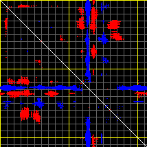 This matrix displays the maximum distance fluctuations between all pairs of CA atoms and between the two extreme conformations that were computed for this mode (DQMIN/DQMAX). Distance increases are plotted in blue and decreases in red for the strongest 10% of the residue pair distance changes. Every pixel corresponds to a single residue. Grey lines are drawn every 10 residues, yellow lines every 100 residues (counting from the upper left corner).