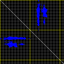 This matrix displays the maximum distance fluctuations between all pairs of CA atoms and between the two extreme conformations that were computed for this mode (DQMIN/DQMAX). Distance increases are plotted in blue and decreases in red for the strongest 10% of the residue pair distance changes. Every pixel corresponds to a single residue. Grey lines are drawn every 10 residues, yellow lines every 100 residues (counting from the upper left corner).