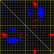 This matrix displays the maximum distance fluctuations between all pairs of CA atoms and between the two extreme conformations that were computed for this mode (DQMIN/DQMAX). Distance increases are plotted in blue and decreases in red for the strongest 10% of the residue pair distance changes. Every pixel corresponds to a single residue. Grey lines are drawn every 10 residues, yellow lines every 100 residues (counting from the upper left corner).