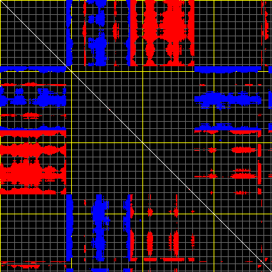 This matrix displays the maximum distance fluctuations between all pairs of CA atoms and between the two extreme conformations that were computed for this mode (DQMIN/DQMAX). Distance increases are plotted in blue and decreases in red for the strongest 10% of the residue pair distance changes. Every pixel corresponds to a single residue. Grey lines are drawn every 10 residues, yellow lines every 100 residues (counting from the upper left corner).