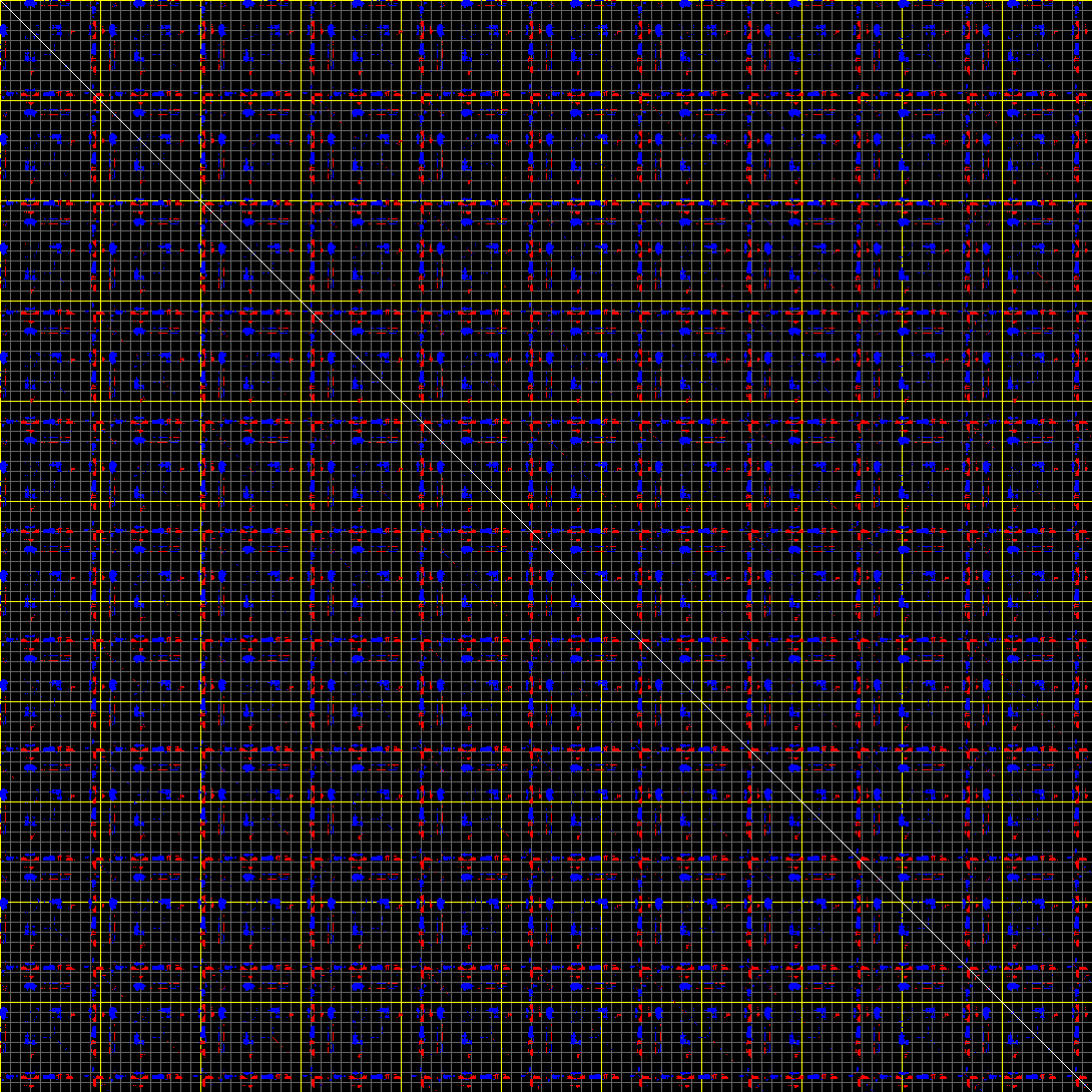 This matrix displays the maximum distance fluctuations between all pairs of CA atoms and between the two extreme conformations that were computed for this mode (DQMIN/DQMAX). Distance increases are plotted in blue and decreases in red for the strongest 10% of the residue pair distance changes. Every pixel corresponds to a single residue. Grey lines are drawn every 10 residues, yellow lines every 100 residues (counting from the upper left corner).