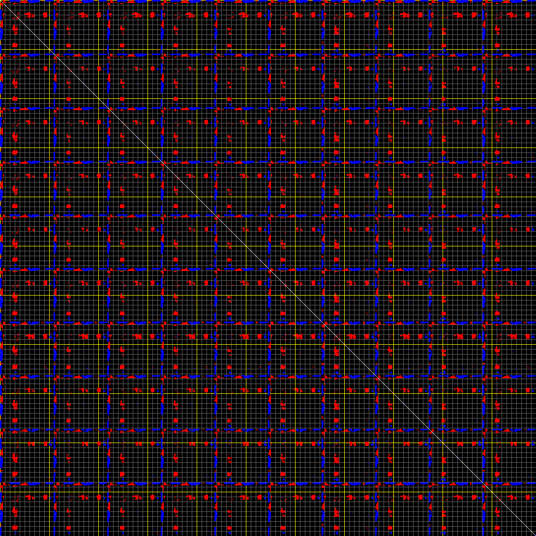 This matrix displays the maximum distance fluctuations between all pairs of CA atoms and between the two extreme conformations that were computed for this mode (DQMIN/DQMAX). Distance increases are plotted in blue and decreases in red for the strongest 10% of the residue pair distance changes. Every pixel corresponds to a single residue. Grey lines are drawn every 10 residues, yellow lines every 100 residues (counting from the upper left corner).