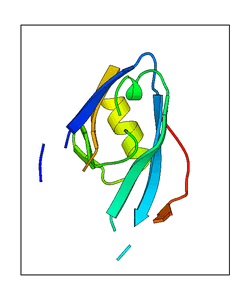 These views are prepared from three orthologuous viewpoints with MolScript. Secondary structures are determined from the C-alpha atom positions of your protein (N-terminal blue, C-terminal red).