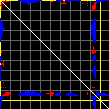 This matrix displays the maximum distance fluctuations between all pairs of CA atoms and between the two extreme conformations that were computed for this mode (DQMIN/DQMAX). Distance increases are plotted in blue and decreases in red for the strongest 10% of the residue pair distance changes. Every pixel corresponds to a single residue. Grey lines are drawn every 10 residues, yellow lines every 100 residues (counting from the upper left corner).