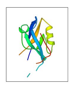 These views are prepared from three orthologuous viewpoints with MolScript. Secondary structures are determined from the C-alpha atom positions of your protein (N-terminal blue, C-terminal red).