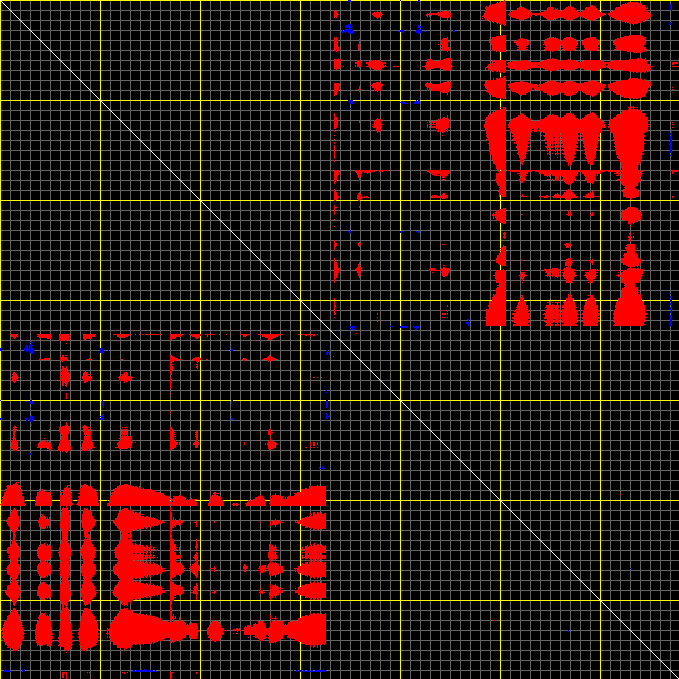 This matrix displays the maximum distance fluctuations between all pairs of CA atoms and between the two extreme conformations that were computed for this mode (DQMIN/DQMAX). Distance increases are plotted in blue and decreases in red for the strongest 10% of the residue pair distance changes. Every pixel corresponds to a single residue. Grey lines are drawn every 10 residues, yellow lines every 100 residues (counting from the upper left corner).