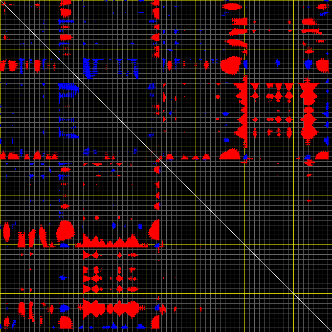 This matrix displays the maximum distance fluctuations between all pairs of CA atoms and between the two extreme conformations that were computed for this mode (DQMIN/DQMAX). Distance increases are plotted in blue and decreases in red for the strongest 10% of the residue pair distance changes. Every pixel corresponds to a single residue. Grey lines are drawn every 10 residues, yellow lines every 100 residues (counting from the upper left corner).