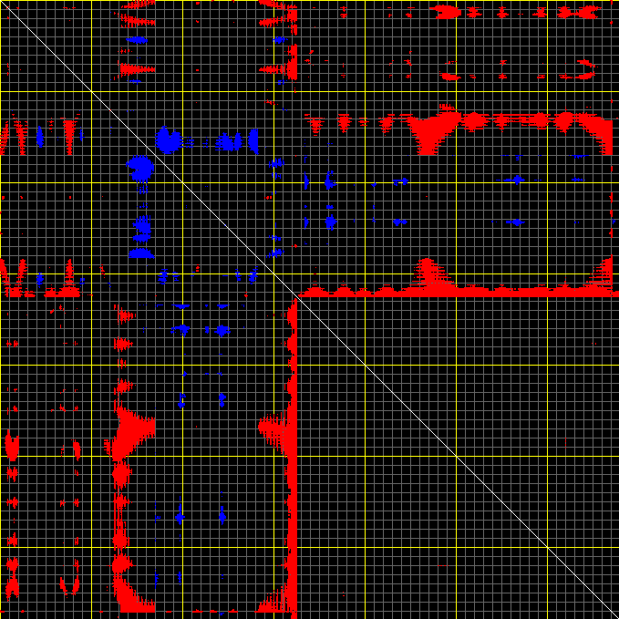 This matrix displays the maximum distance fluctuations between all pairs of CA atoms and between the two extreme conformations that were computed for this mode (DQMIN/DQMAX). Distance increases are plotted in blue and decreases in red for the strongest 10% of the residue pair distance changes. Every pixel corresponds to a single residue. Grey lines are drawn every 10 residues, yellow lines every 100 residues (counting from the upper left corner).