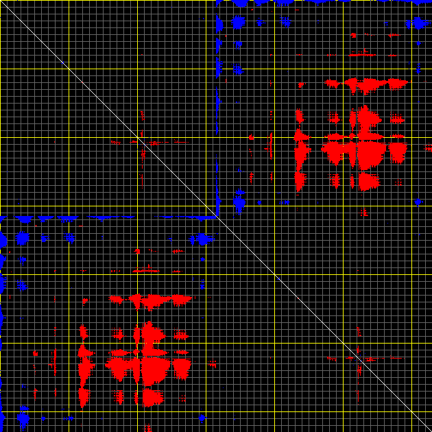 This matrix displays the maximum distance fluctuations between all pairs of CA atoms and between the two extreme conformations that were computed for this mode (DQMIN/DQMAX). Distance increases are plotted in blue and decreases in red for the strongest 10% of the residue pair distance changes. Every pixel corresponds to a single residue. Grey lines are drawn every 10 residues, yellow lines every 100 residues (counting from the upper left corner).