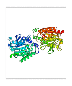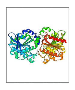 These views are prepared from three orthologuous viewpoints with MolScript. Secondary structures are determined from the C-alpha atom positions of your protein (N-terminal blue, C-terminal red).
