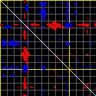 This matrix displays the maximum distance fluctuations between all pairs of CA atoms and between the two extreme conformations that were computed for this mode (DQMIN/DQMAX). Distance increases are plotted in blue and decreases in red for the strongest 10% of the residue pair distance changes. Every pixel corresponds to a single residue. Grey lines are drawn every 10 residues, yellow lines every 100 residues (counting from the upper left corner).