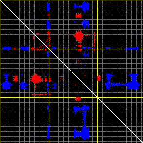 This matrix displays the maximum distance fluctuations between all pairs of CA atoms and between the two extreme conformations that were computed for this mode (DQMIN/DQMAX). Distance increases are plotted in blue and decreases in red for the strongest 10% of the residue pair distance changes. Every pixel corresponds to a single residue. Grey lines are drawn every 10 residues, yellow lines every 100 residues (counting from the upper left corner).