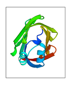 These views are prepared from three orthologuous viewpoints with MolScript. Secondary structures are determined from the C-alpha atom positions of your protein (N-terminal blue, C-terminal red).