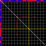 This matrix displays the maximum distance fluctuations between all pairs of CA atoms and between the two extreme conformations that were computed for this mode (DQMIN/DQMAX). Distance increases are plotted in blue and decreases in red for the strongest 10% of the residue pair distance changes. Every pixel corresponds to a single residue. Grey lines are drawn every 10 residues, yellow lines every 100 residues (counting from the upper left corner).