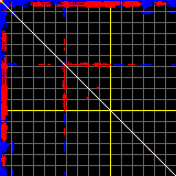 This matrix displays the maximum distance fluctuations between all pairs of CA atoms and between the two extreme conformations that were computed for this mode (DQMIN/DQMAX). Distance increases are plotted in blue and decreases in red for the strongest 10% of the residue pair distance changes. Every pixel corresponds to a single residue. Grey lines are drawn every 10 residues, yellow lines every 100 residues (counting from the upper left corner).