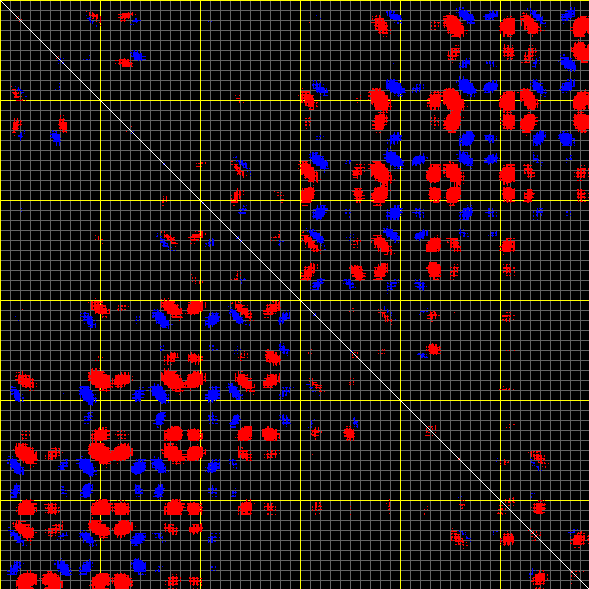 This matrix displays the maximum distance fluctuations between all pairs of CA atoms and between the two extreme conformations that were computed for this mode (DQMIN/DQMAX). Distance increases are plotted in blue and decreases in red for the strongest 10% of the residue pair distance changes. Every pixel corresponds to a single residue. Grey lines are drawn every 10 residues, yellow lines every 100 residues (counting from the upper left corner).
